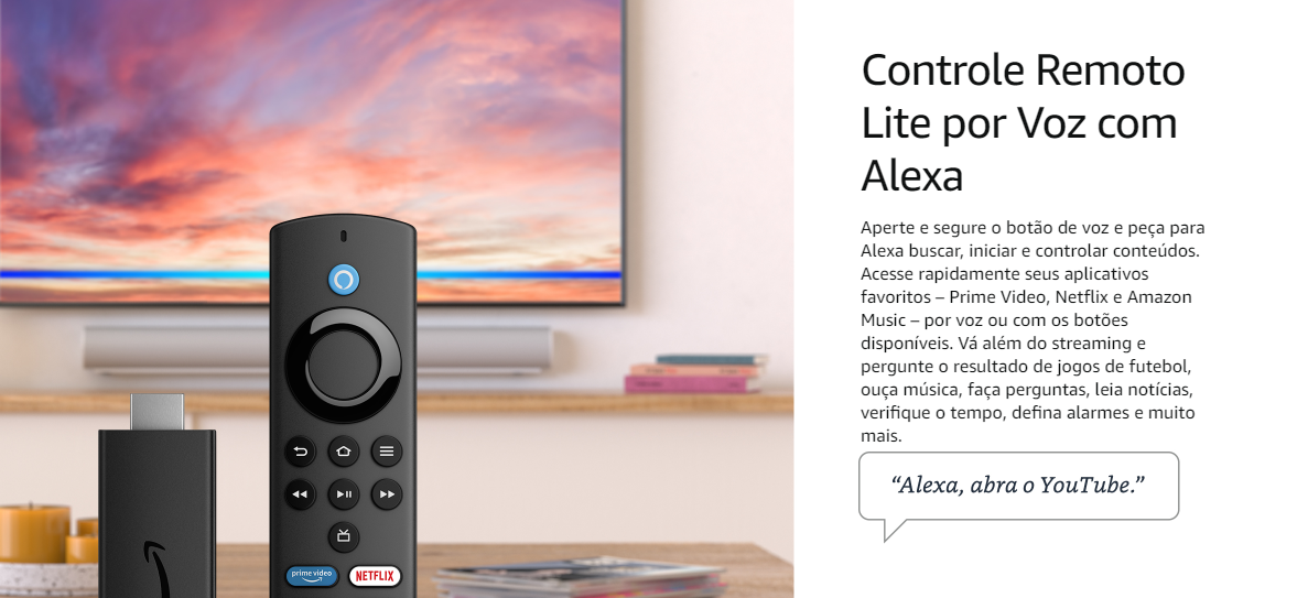 O Fire TV Stick Lite com Controle por Voz e Alexa Amazon, é o produto perfeito para sua casa. Com ele você acessa facilmente seus aplicativos e conteúdos favoritos. Centenas de canais disponíveis na loja de aplicativos, incluindo Prime Vídeo, Netflix, YouTube, Disney+, Amazon Music, Spotify, Globo Play e muitos outros.